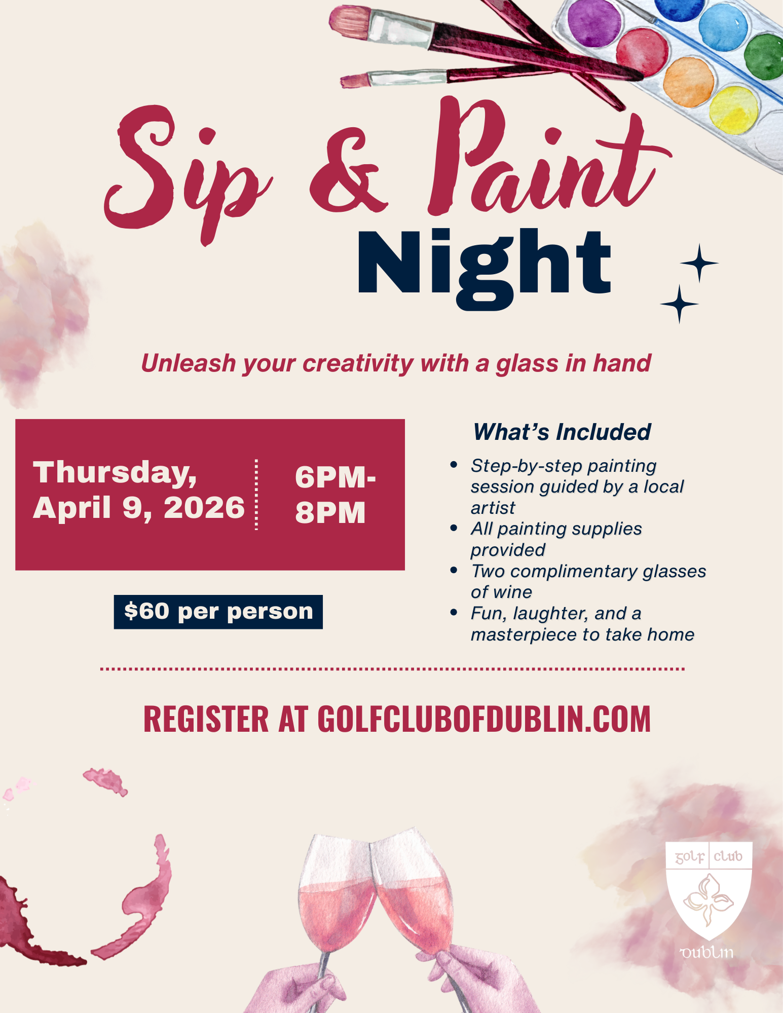 Join us on Thursday, April 9, 2026, from 6:00–8:00 PM for a relaxing and fun-filled Sip & Paint at Golf Club of Dublin. Whether you’re a seasoned artist or just in it for the wine, this guided painting experience is perfect for a night out with friends.